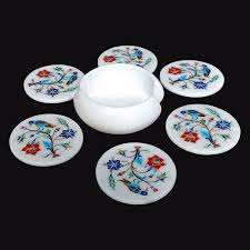 Sous-verres en marbre blanc faits à la main avec incrustation en métal carré 4x4 pouces Ensemble de 6 sous-verres de table décoratifs avec support