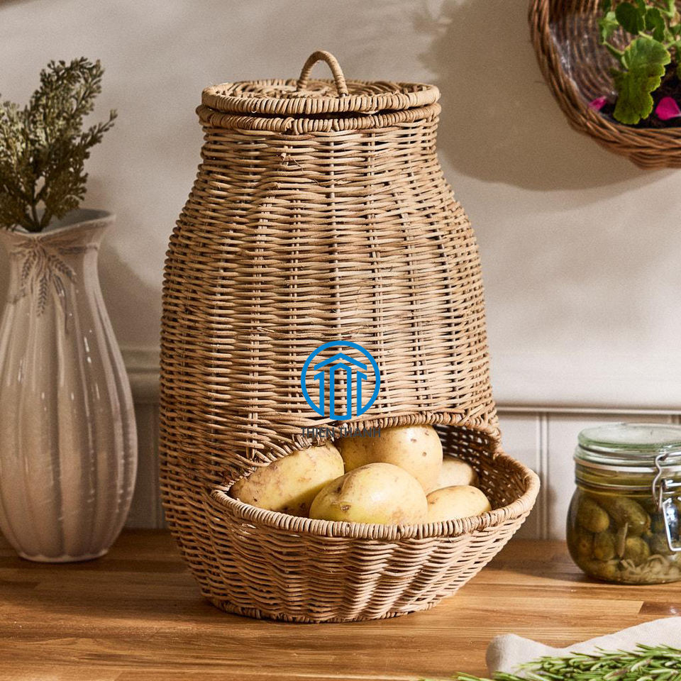 Handmade Wicker Potato Storage Basket with Lid Natural Rattan Vegetable Organizer Bin for Kitchen Pantry and Home Decoration