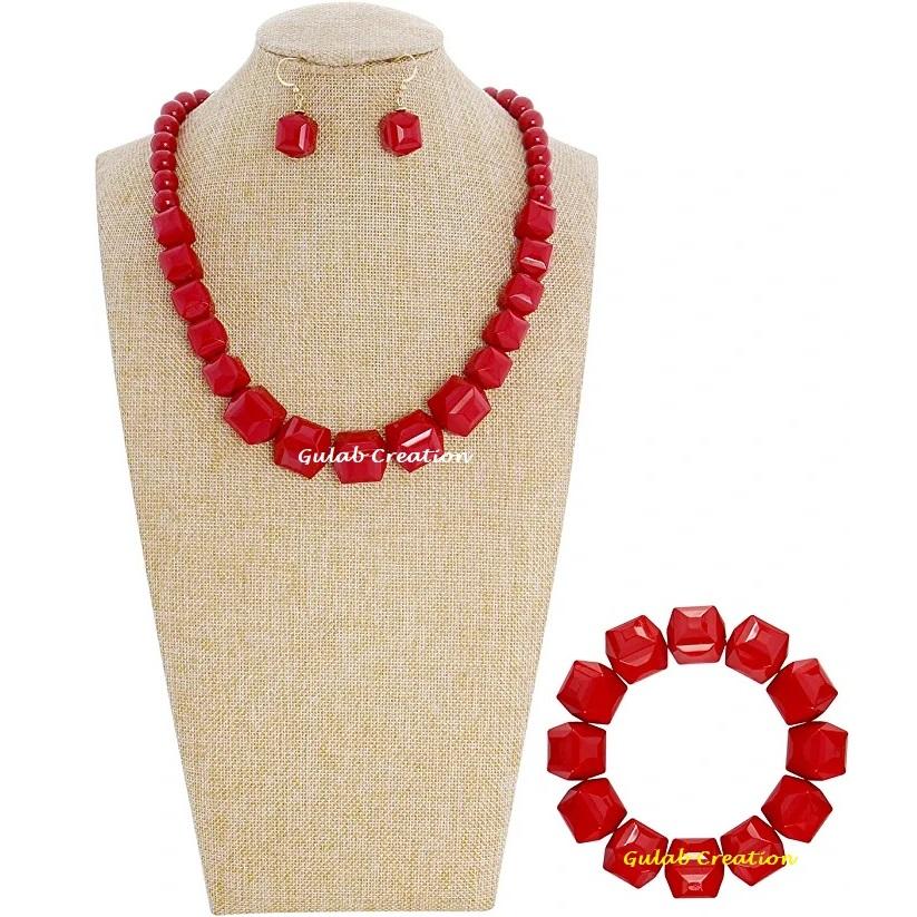 Ensemble de bijoux en résine rouge de forme géométrique pour femmes-Collier de déclaration Boucles d'oreilles et bracelet Accessoires de mode