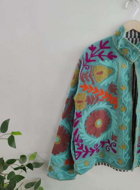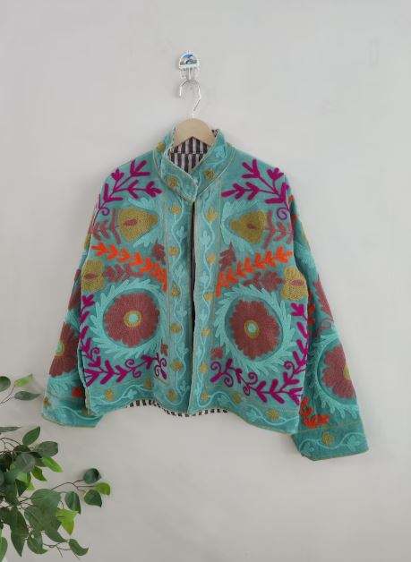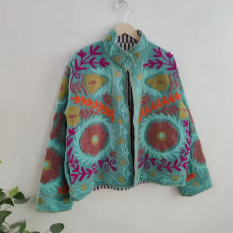 Handmade Women's Slim-Fit Autumn Jacket Coat Floral Suzani Embroidery Printed Knitted Fleece Fabric Quilted Cotton Filling New