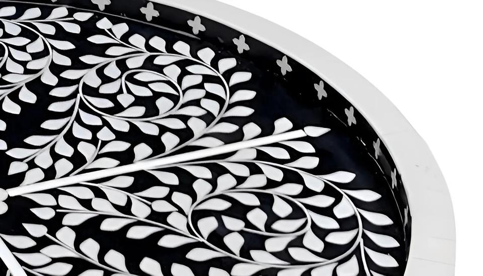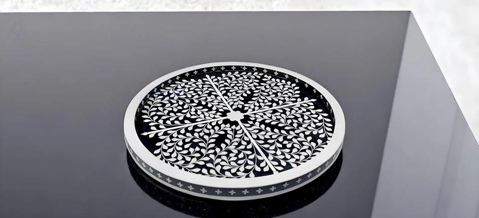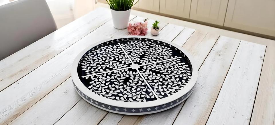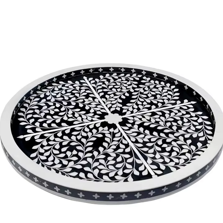 Plateau de service moderne en incrustation d'os en bois floral fait à la main meilleurs prix pour plateau décoratif de couleur noir blanc pour mariage Diwali