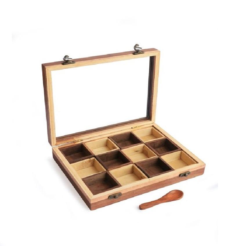 Boîte à épices en bois faite à la main avec plusieurs compartiments pour le stockage et l'affichage des assaisonnements d'épices d'herbes de cuisine