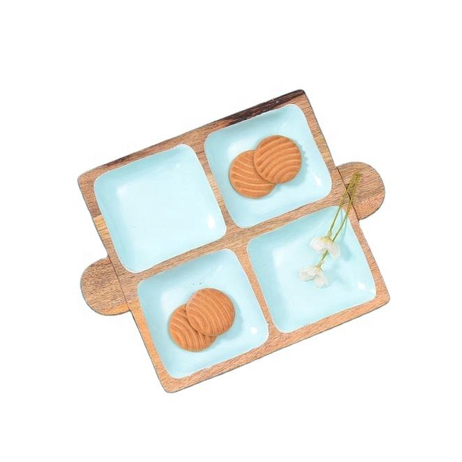 Plateau de service à fruits secs, en forme carrée en bois fait à la main, avec 4 ouvertures décoratives spéciales, produit de vente et produit de haute qualité