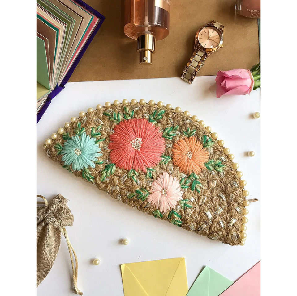 Sac à main en jute tissé à la main avec garniture en perles et broderie florale rose, sac de soirée, accessoire de mode pour femme