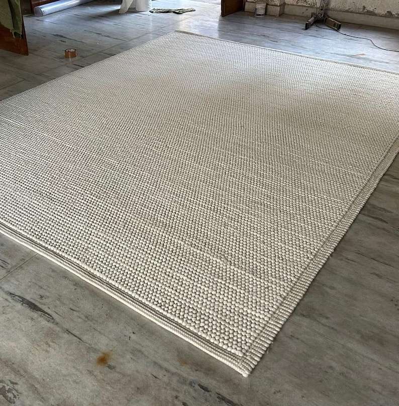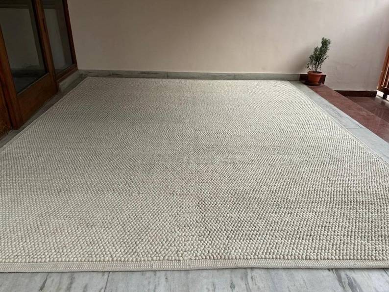 Tapis artisanal tissé à la main en laine avec bordure en boucle, antidérapant, adapté aux animaux domestiques, style scandinave, couleur unie, poils moyens, pour usage domestique, en latex