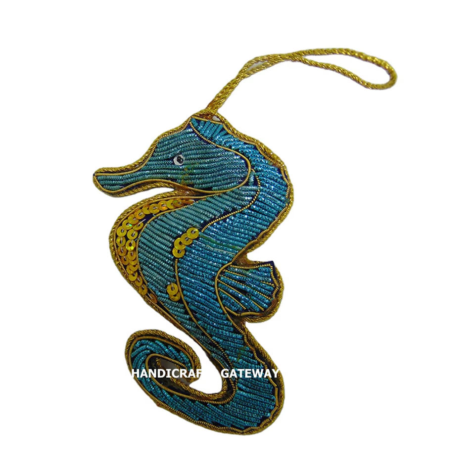 Matériel de tissu d'ornement suspendu d'arbre de Noël de broderie de Zari faite à la main avec la forme de cheval de mer utilisée pour la décoration de fête d'anniversaire