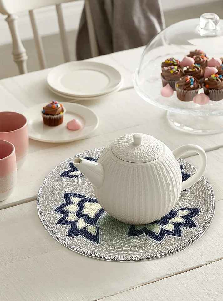 Set de table rond en verre fait main, perlé, argenté et doré avec des perles blanches, 14 pouces, écologique