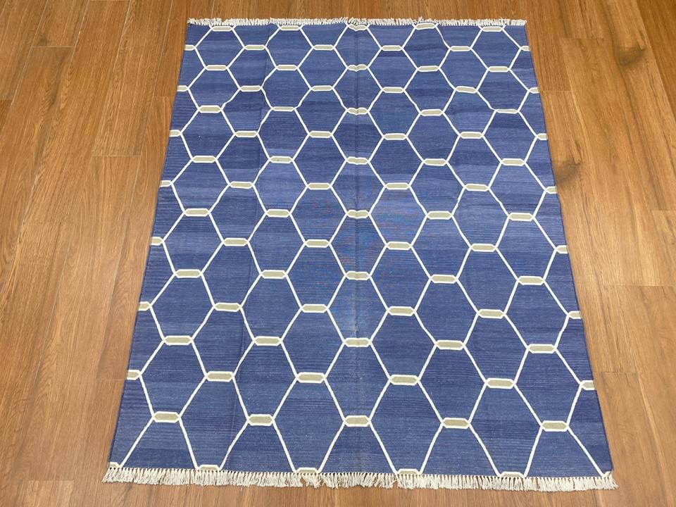 Tapis en coton bleu fait main et tissé à la main, design géométrique moderne en treillis, écologique, lavable, antidérapant, à poils courts, doux et durable pour le sol