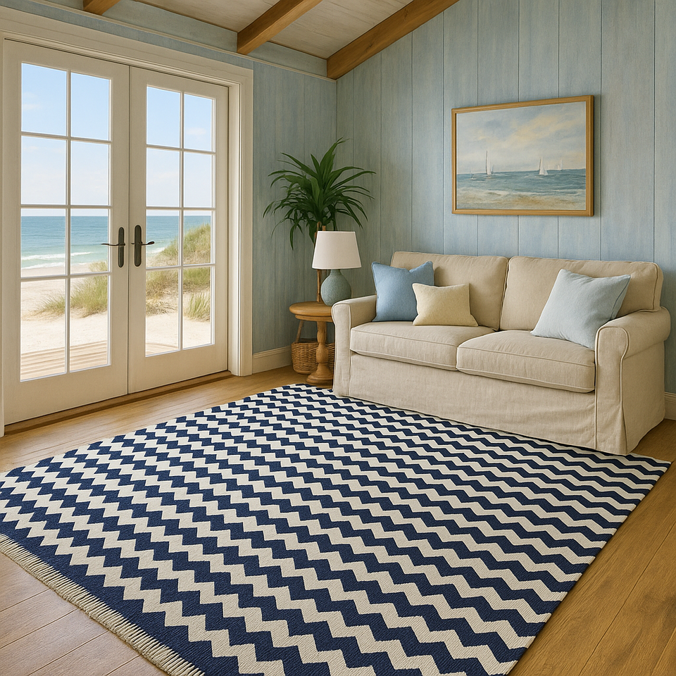 Tapis en coton tissé à la main avec motif en chevron bleu marine et blanc, doux, léger, écologique, tapis de prière moderne pour le sol