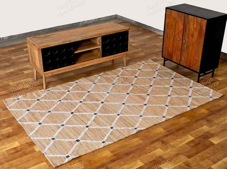 Tapis en jute naturel tissé à la main | Tapis d'intérieur à motif abstrait moderne | Tapis de sol en chanvre écologique et adapté aux animaux domestiques, salon, chambre à coucher