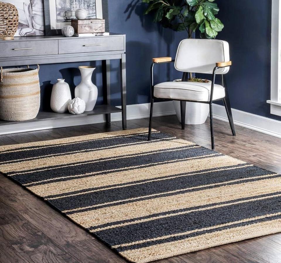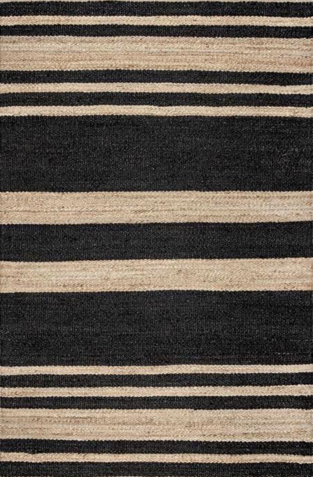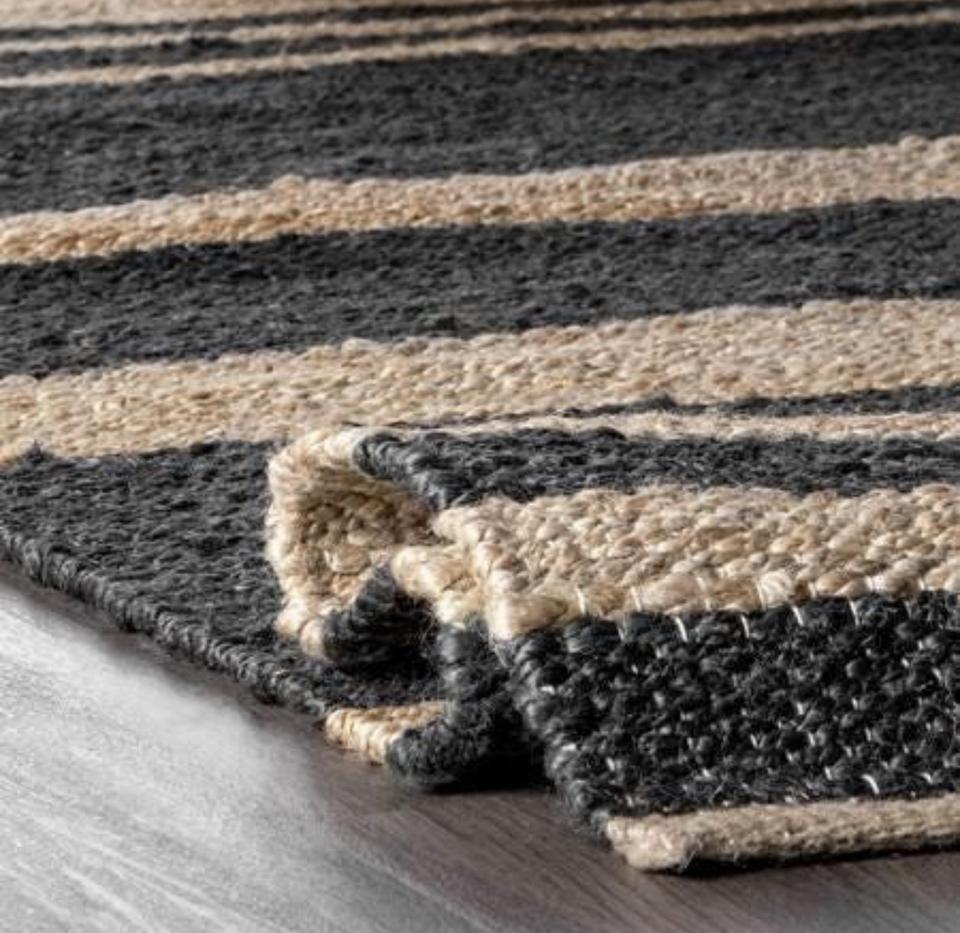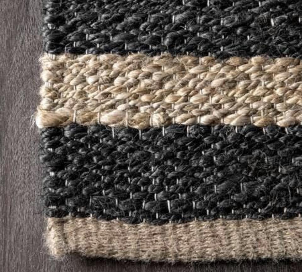 Tapis en jute naturel tissé à la main avec un design rayé moderne, durable, écologique, à poils plats, épaisseur moyenne, pour la maison et le salon