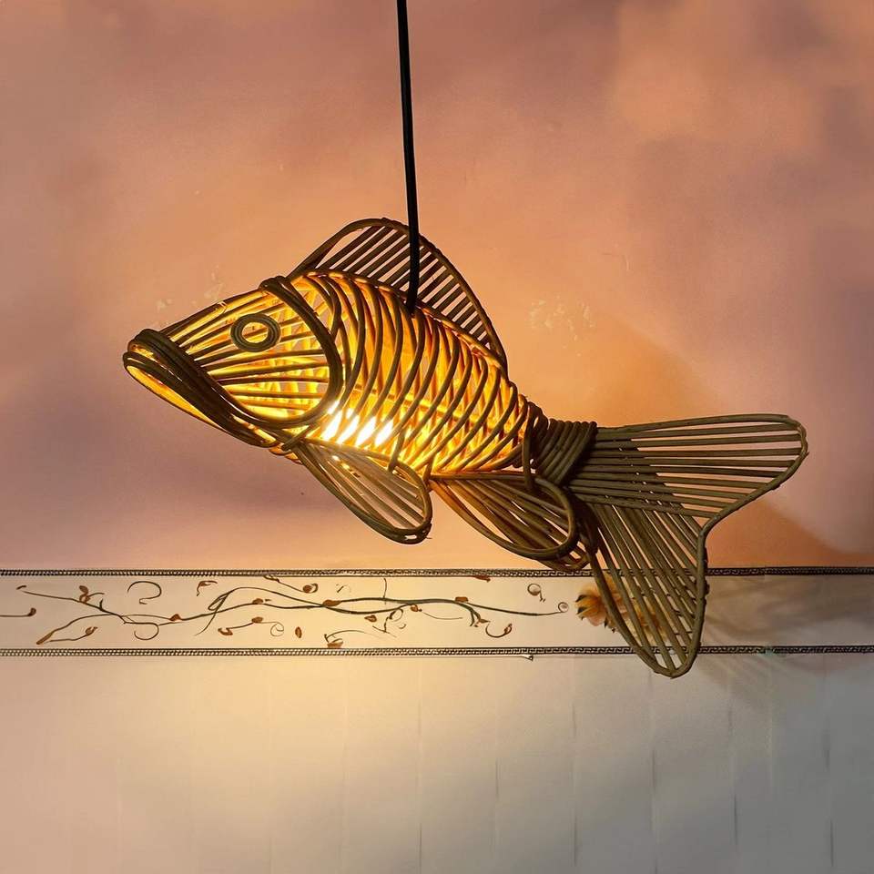 Lampe suspendue en forme de poisson en rotin naturel tissé à la main pour la décoration intérieure