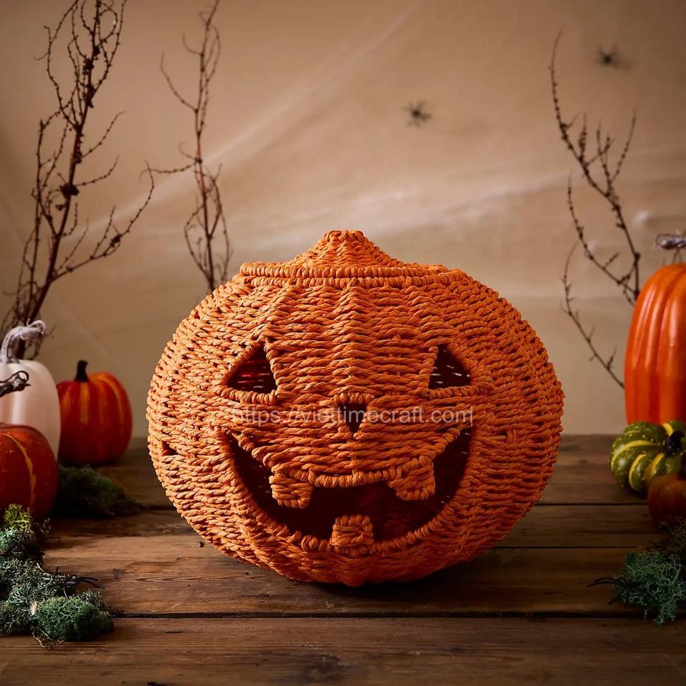 Handwoven Pumpkin Paper Rope/ Straw Basket With Lid for Halloween Holiday Wholesale Vietnam