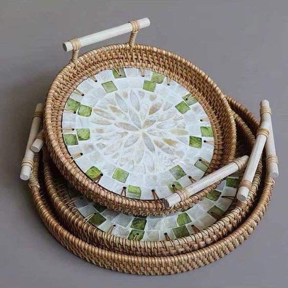 Plateau de rangement en rotin tissé à la main avec forme ronde panier en osier pain assiette alimentaire plateau à gâteau aux fruits dîner plateau de service