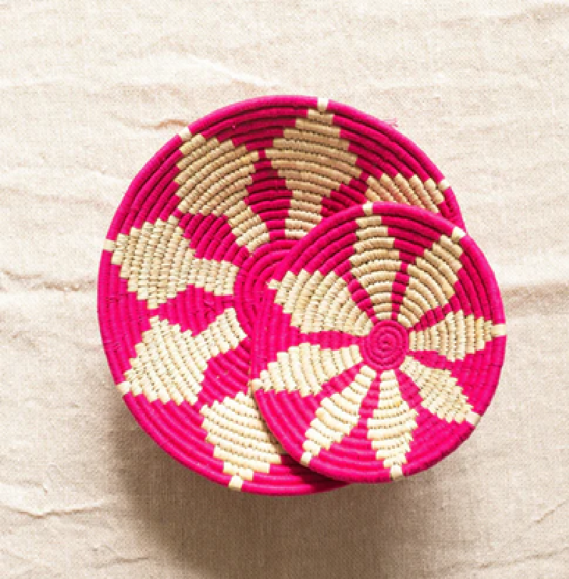 Ensemble de trois plaques murales en herbe moonj tissées à la main avec des motifs à carreaux et en spirale noirs et blancs, disponibles au prix de gros.