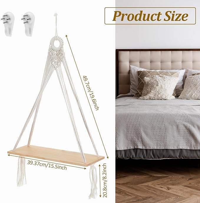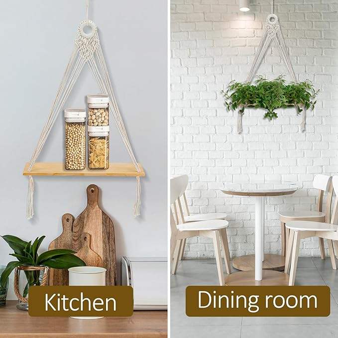 Étagère murale suspendue en macramé avec un design minimaliste et un travail de corde artisanal adapté aux intérieurs modernes ou bohèmes