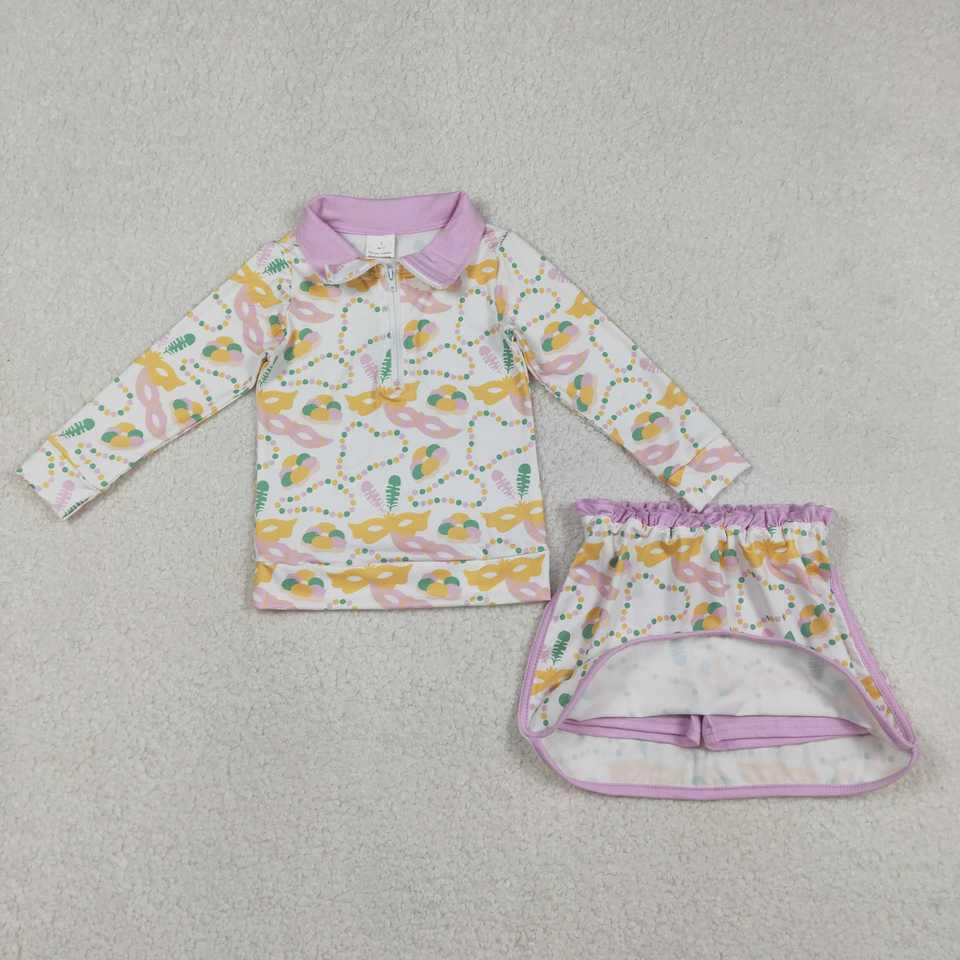 Happy Mardi Gras Hot Sale Cute Doughnut Long Sleeve Zipper Pullover Top with Skirt Casual Polyester Boutique Outfit