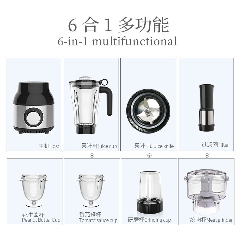 Blender Happy Partner 6-en-1 pour la cuisine, robot culinaire, mixeur, hachoir à viande et à légumes
