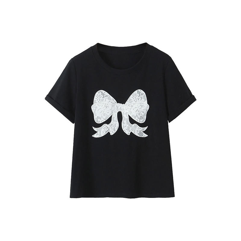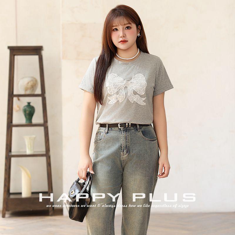 Happy Plus Tee-shirt à manches courtes avec nœud brodé, haut tricoté d'été pour femme, grande taille, noir