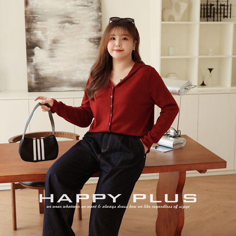 Pull cardigan à capuche Happy Plus pour femme, grande taille, couleur unie, boutonné sur le devant, manches longues, coupe ample, tricoté, rouge, noir, abricot