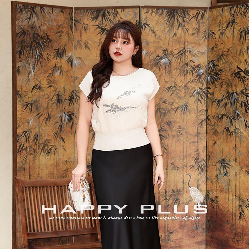 Happy Plus Nouveau haut tricoté brodé de style chinois à manches courtes pour femme, grande taille, coupe ample, épaisseur moyenne, avec étiquette