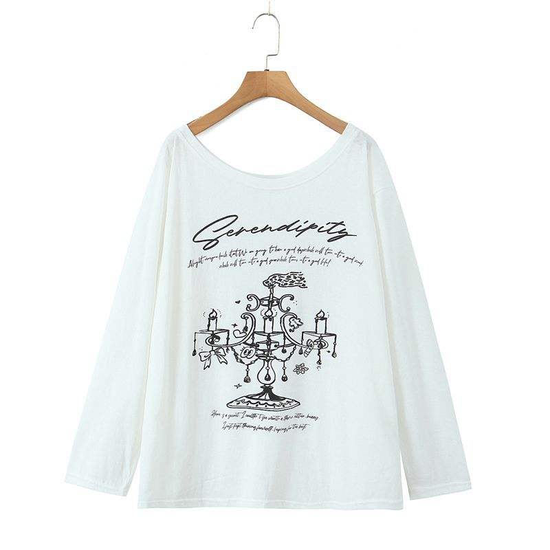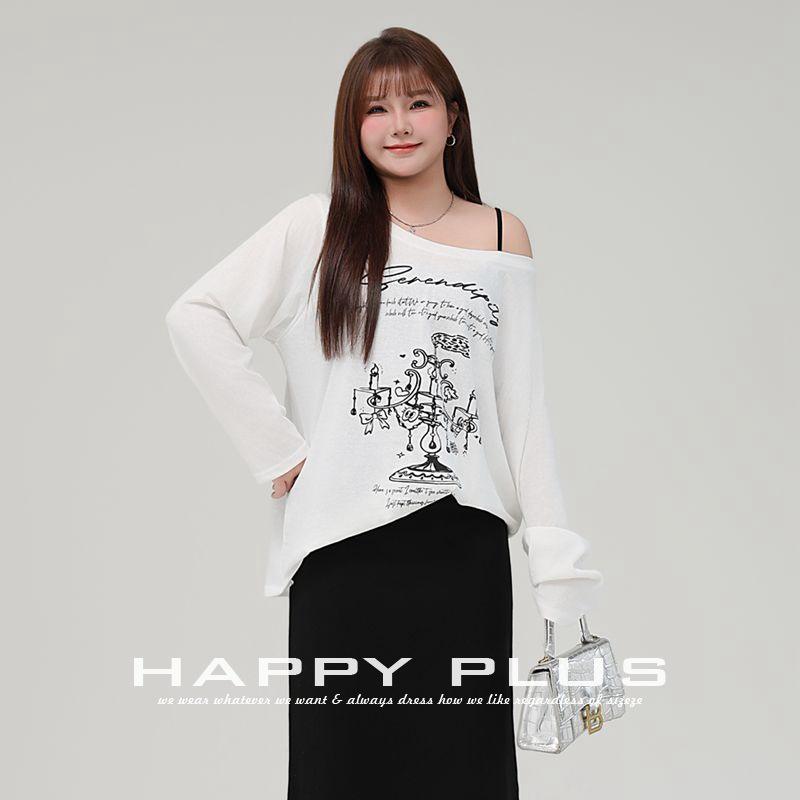 Happy Plus T-shirt imprimé à manches longues et épaules dénudées pour femme, haut en coton tricoté, grande taille, blanc N9183