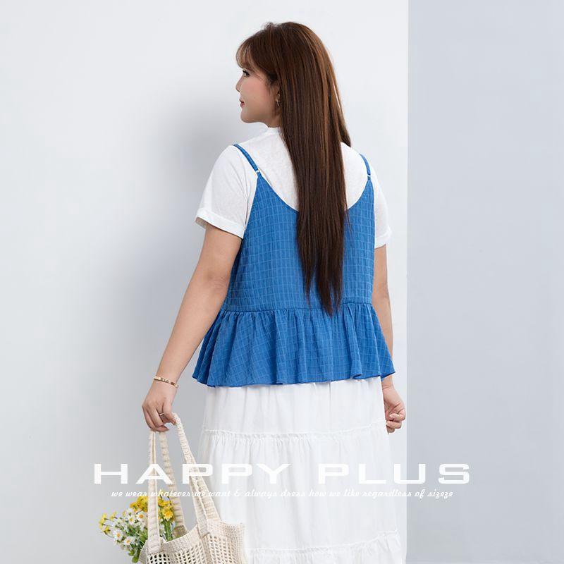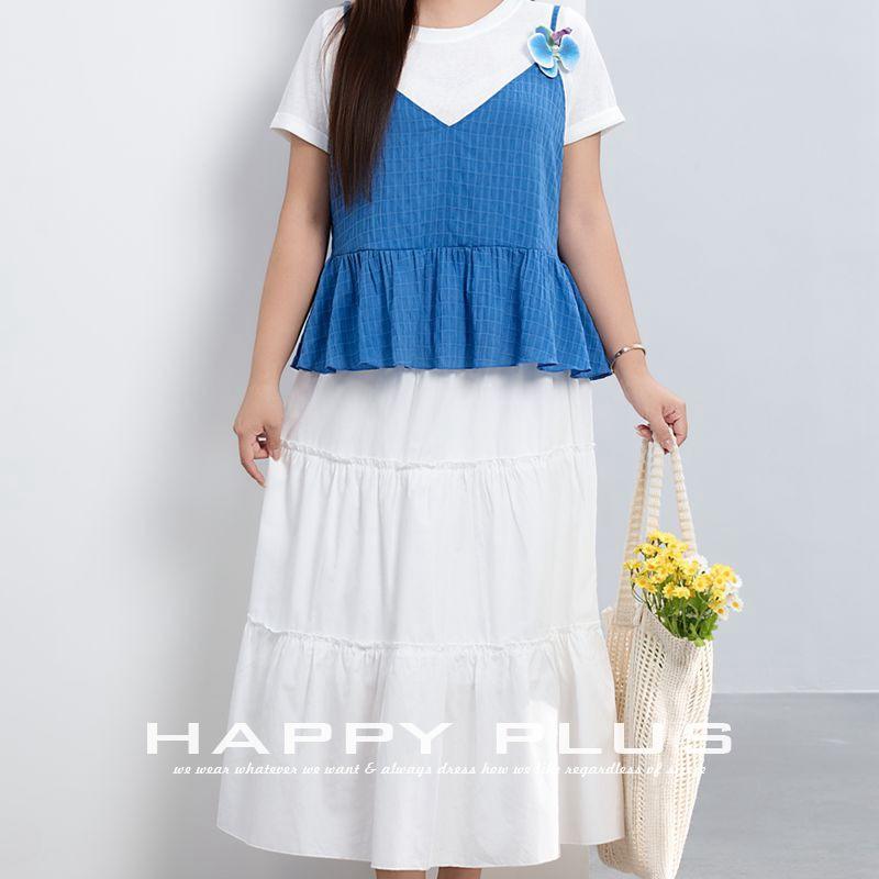Ensemble décontracté pour femme Happy Plus : Gilet ample à volants superposés et col en V, jupe midi en tissu Oxford, grandes tailles, idéal pour les vacances