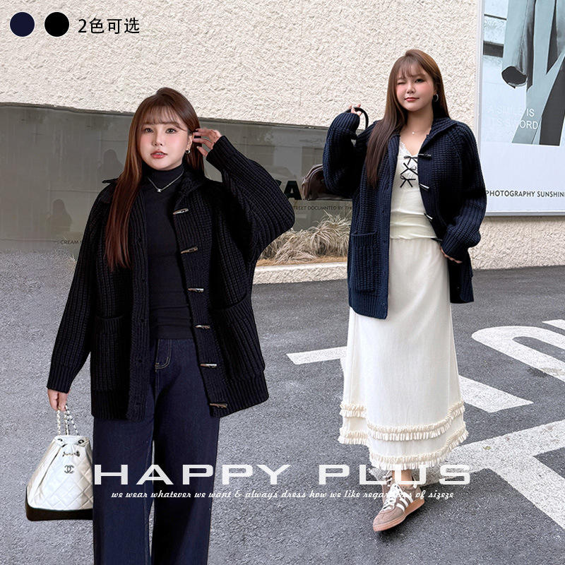 Happyhut Cardigan en tricot épais grande taille, col montant, boutons en corne, coupe ample, pull chaud, manches longues, couleur unie