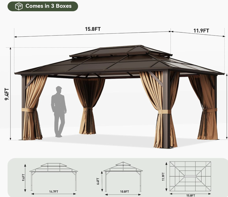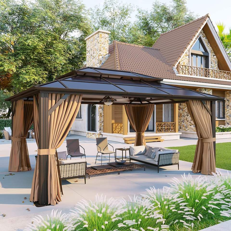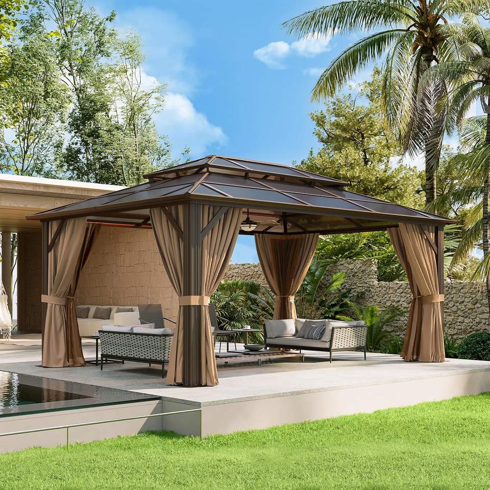 Gazebo à toit rigide, pavillon permanent à structure en aluminium avec rideaux et moustiquaire, auvent extérieur à double toit en polycarbonate