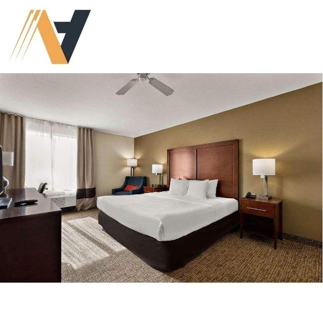 Projet de bois dur Comfort Inn OEM ODM Bois Nouveau design style concis Armoire Table de chevet Commode TV Table Hôtel Meubles de chambre à coucher