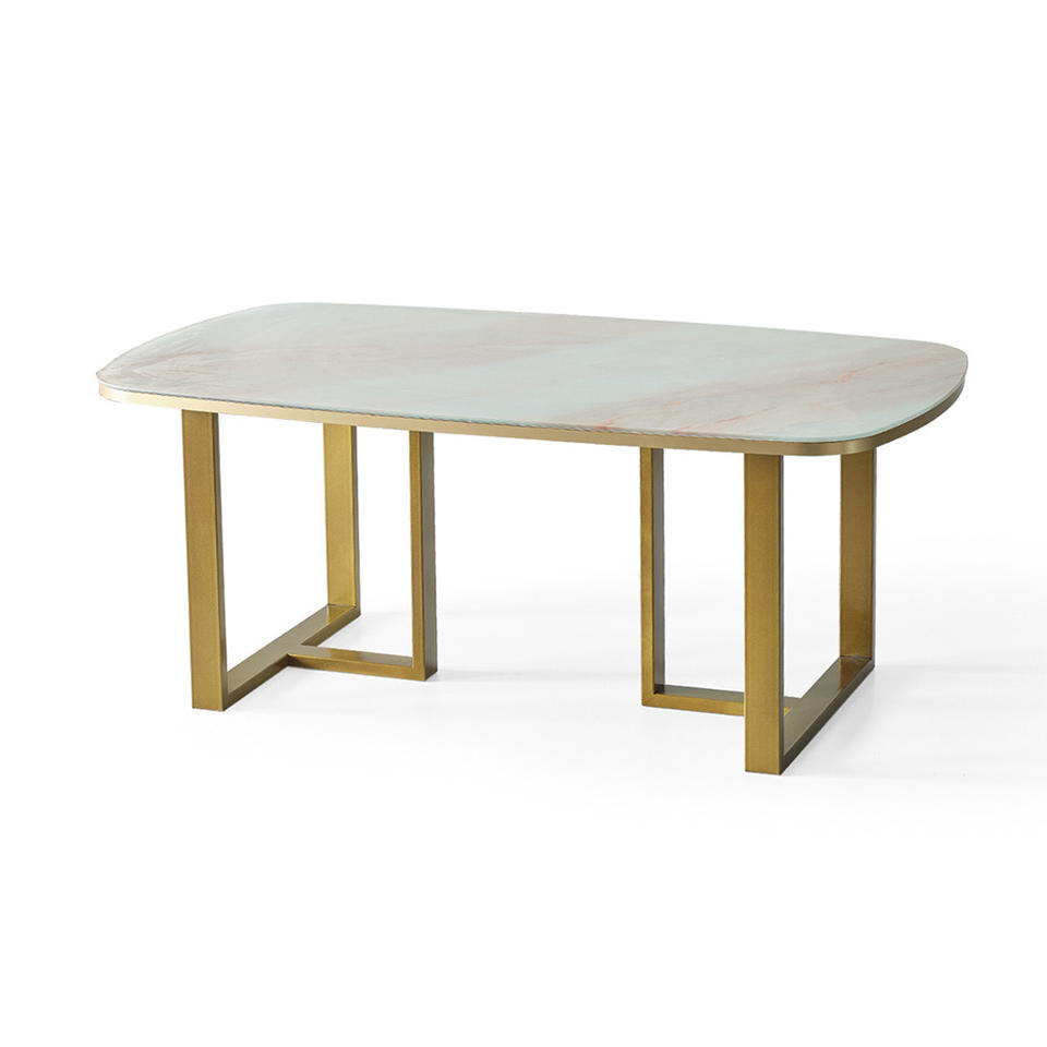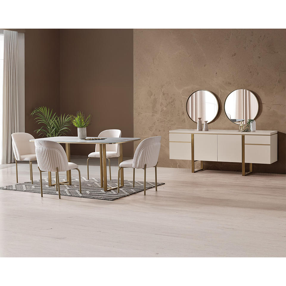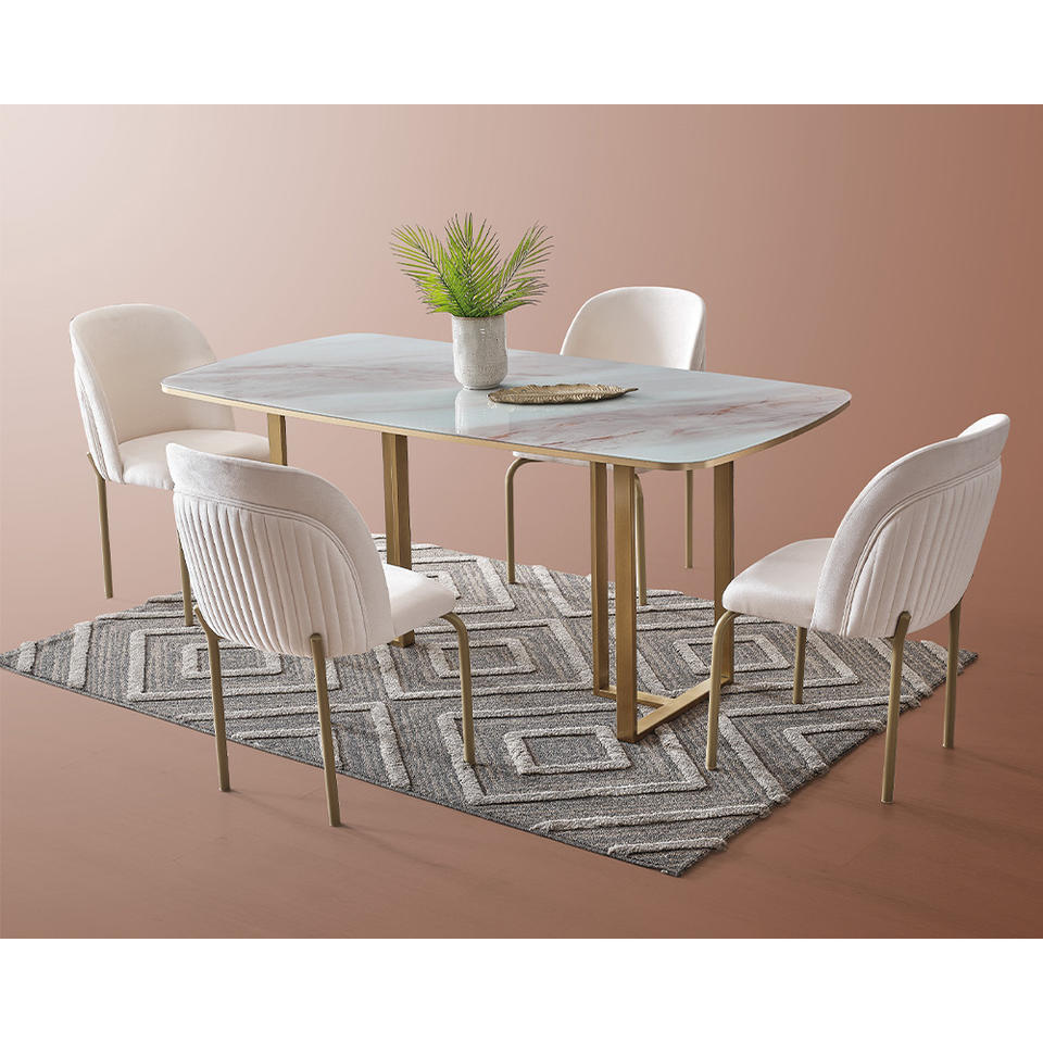 Ensemble de salle à manger moderne Harmony avec plateau de table en verre design marbre et pieds en métal, design contemporain prêt à l'exportation