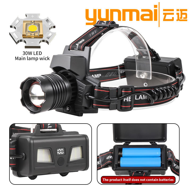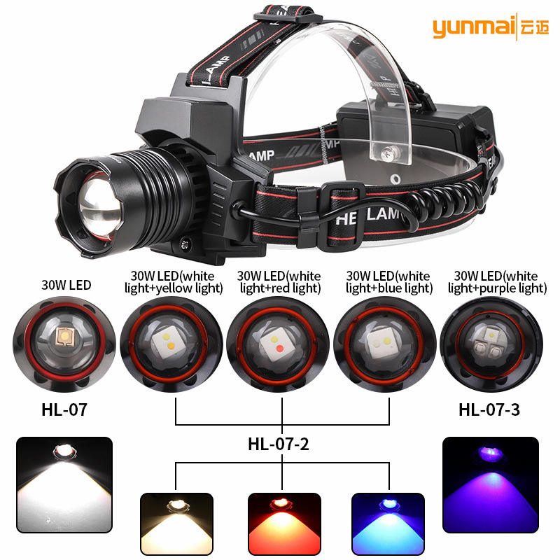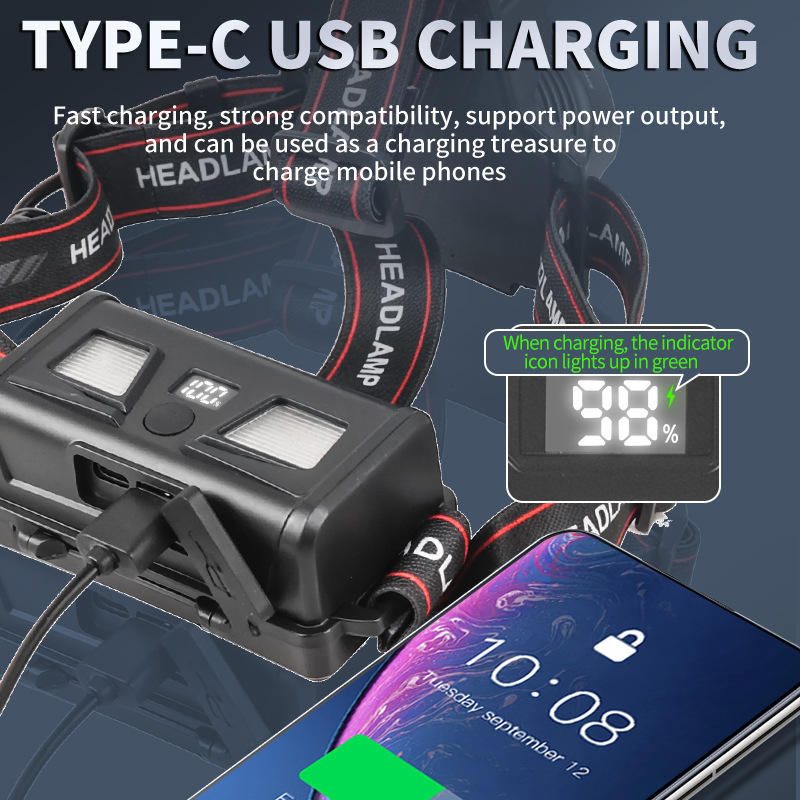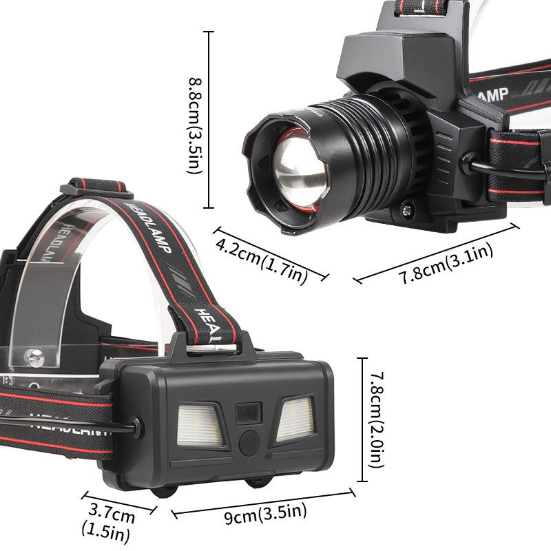 Lampe frontale LED rechargeable 2000 mAh, bandeau réglable, double source lumineuse, affichage numérique ultraviolet, zoom longue portée