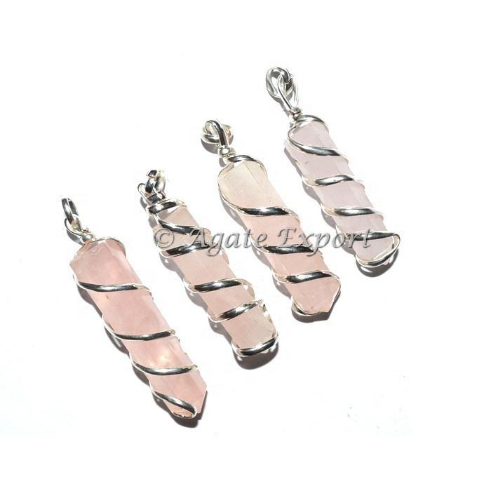Guérison et amour Style Rose Quartz crayon Wrap pierre pendentifs cristal naturel Agate sculpté avec Sier fil motif Feng Shui