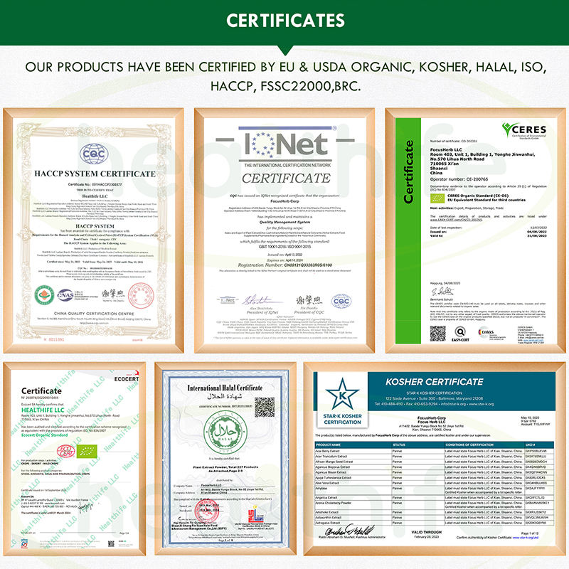 Certificat:ISO 9001, casher, halal, UE, USDA,HACCP,FSSC 22000, organique