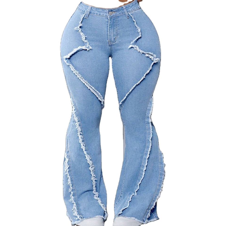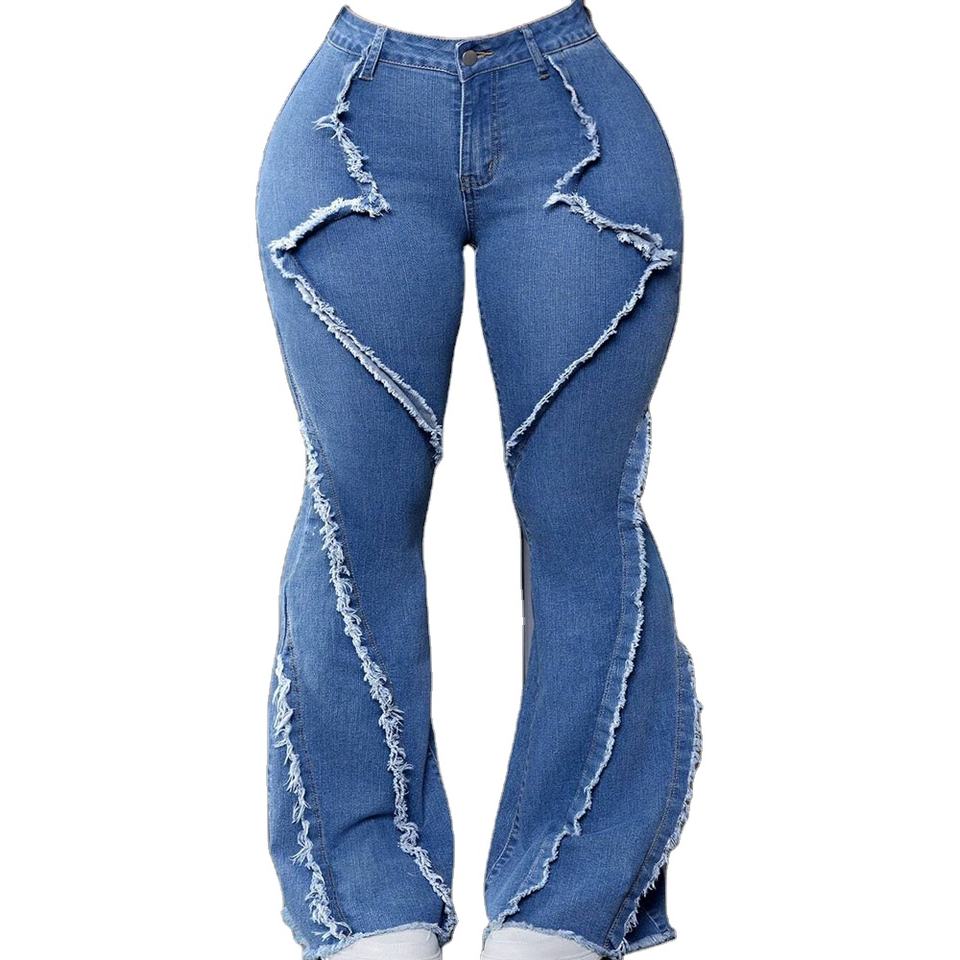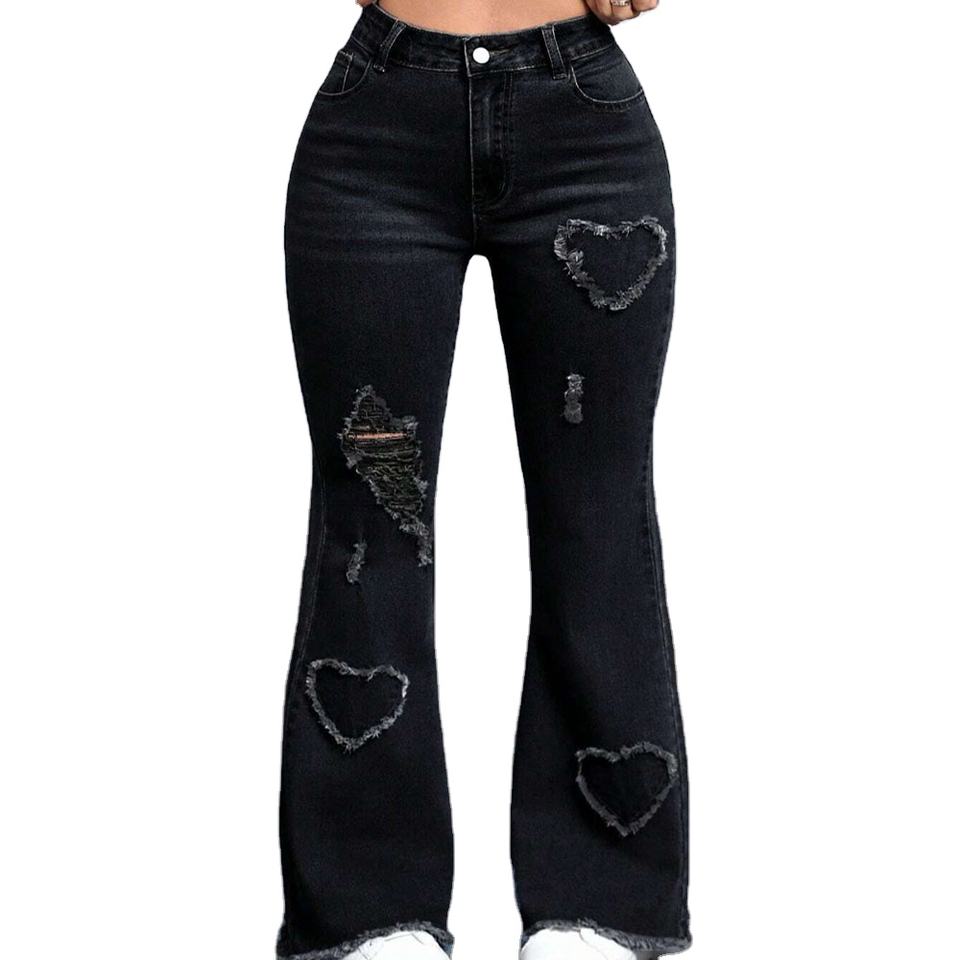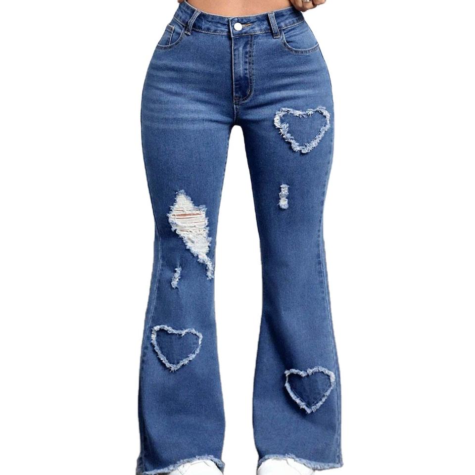 Jean en denim évasé déchiré en forme de cœur pour femme, taille mi-haute, bleu, coton écologique 220g, pantalon effet vieilli