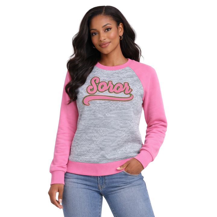 Heather Grey Soror Raglan Sleeve Crewneck Sweatshirt Greek Sorority Women Pink & Green College Sisterhood Stylish Casual Apparel