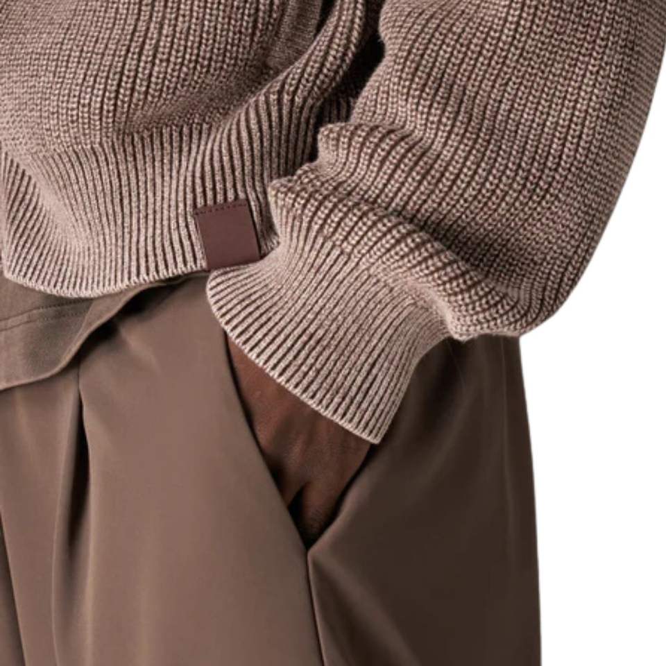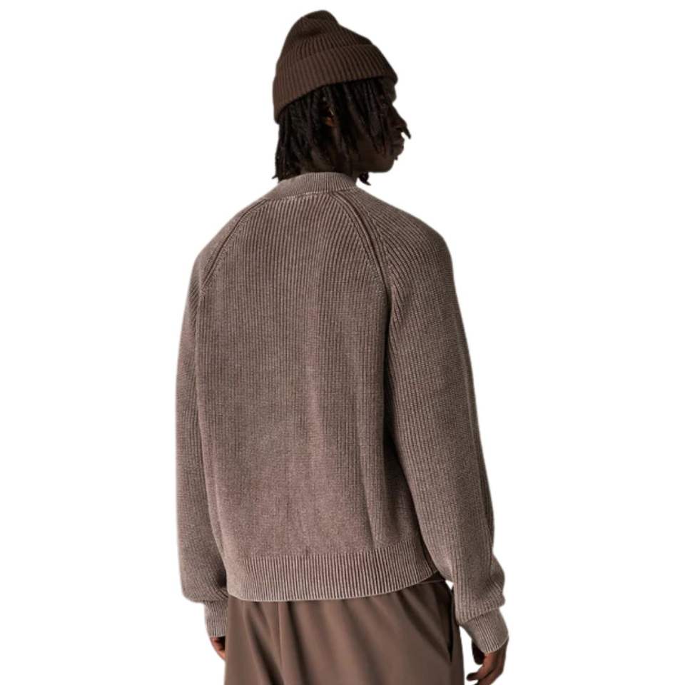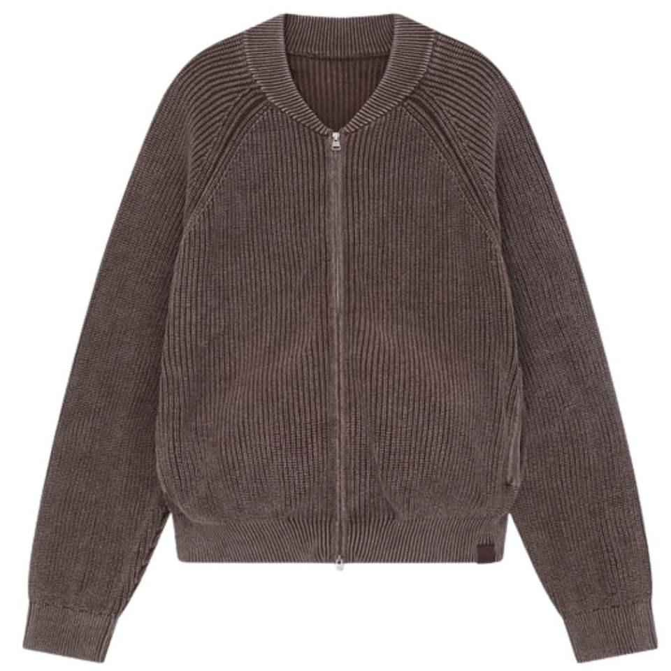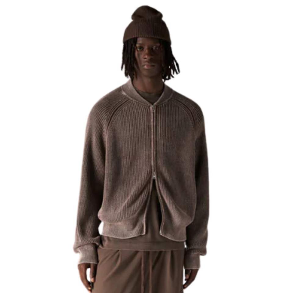Blouson Bomber Homme Marron Foncé Lavé en Maille Côtelée, Veste Décontractée à Fermeture Éclair avec Poignets et Ourlet Côtelés, Vêtement d'Extérieur Tendance