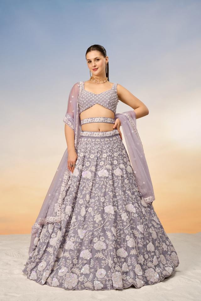 Designer lourd lavande Net paillettes Moti mariage formel mariée Lehenga Choli & Dupatta