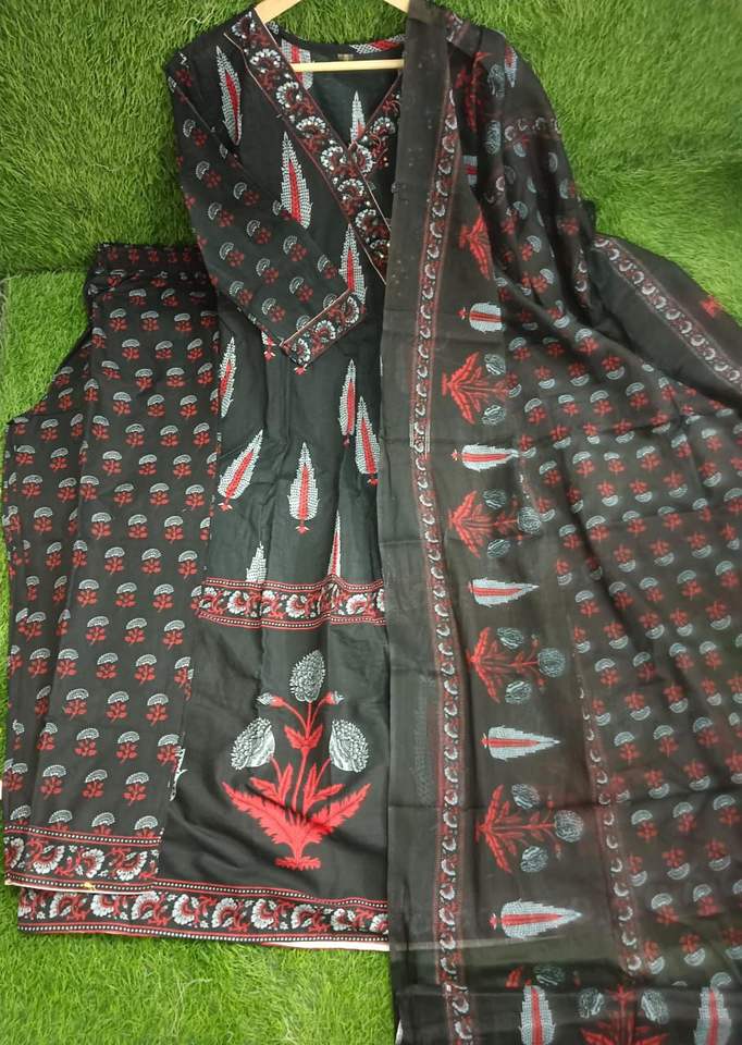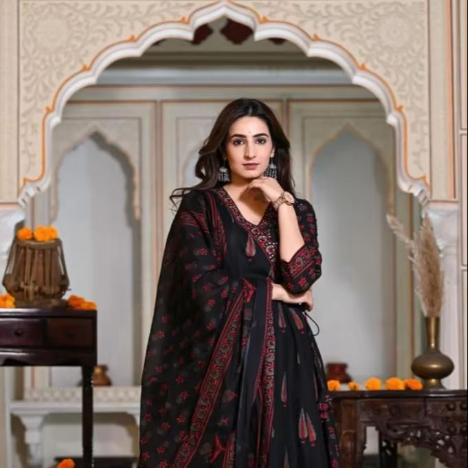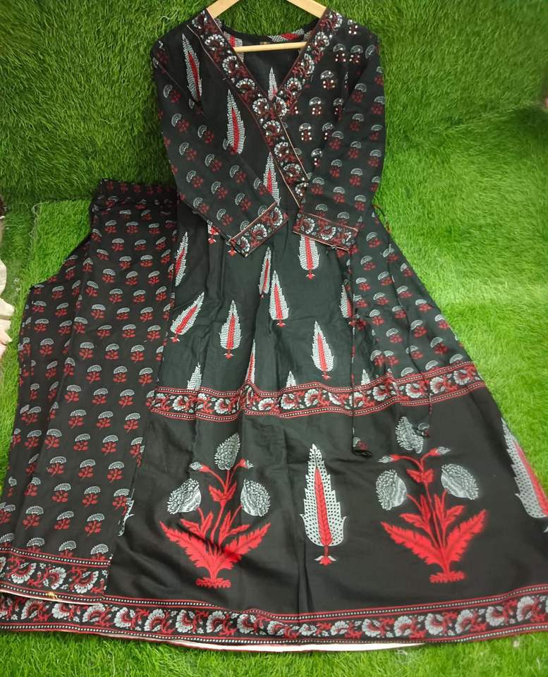 Nom du produit:Pur Coton Angrakha Style Imprimé Anarkali Kurta Et Pantalon Dupatta