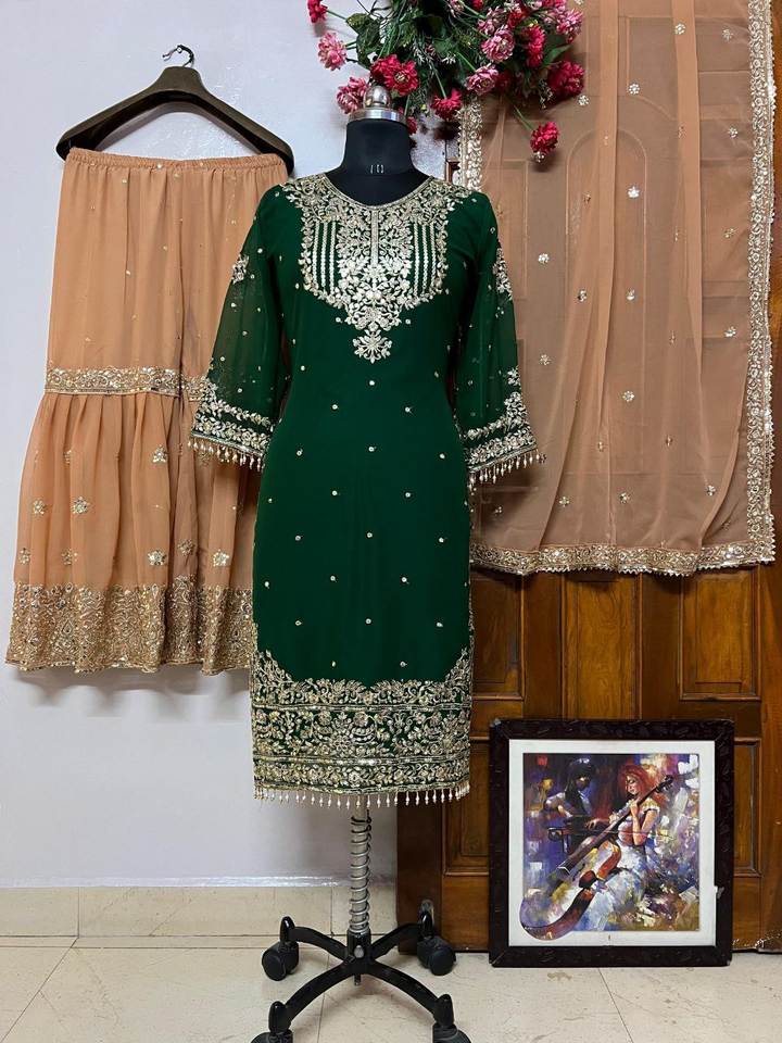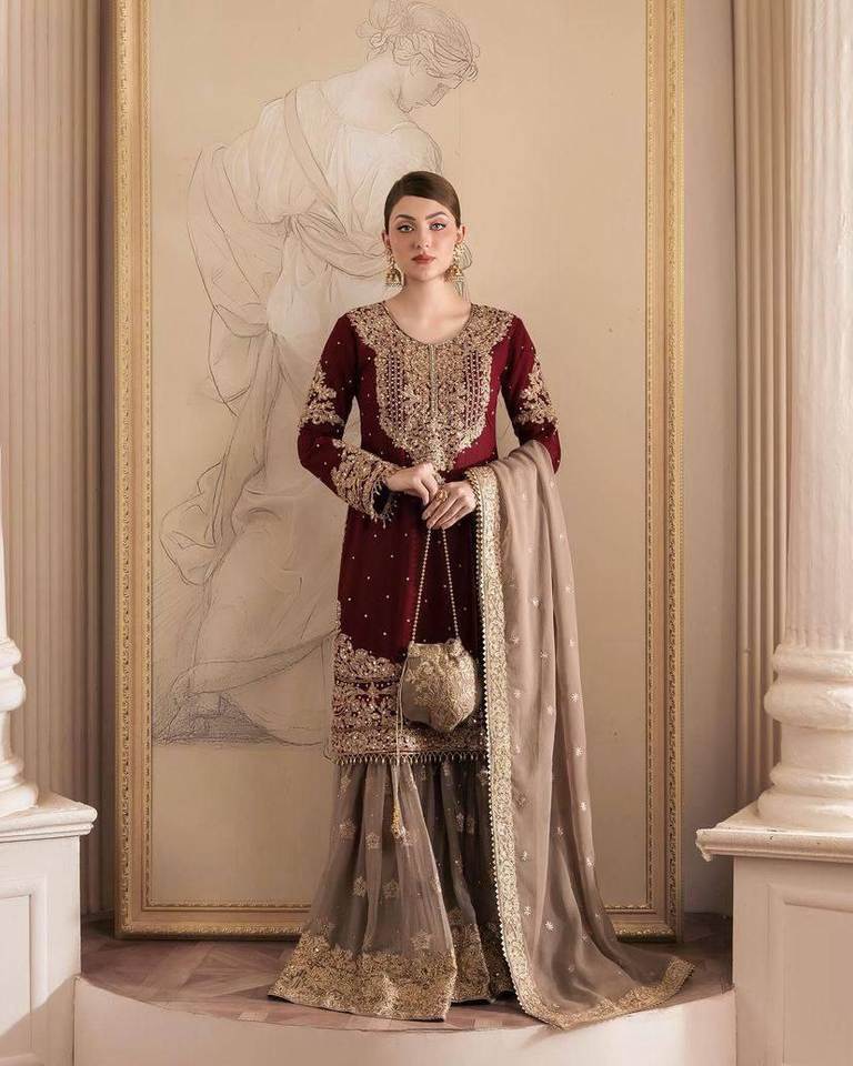 Top de créateur lourd-Collection de costumes Sharara Tissus lourds en Georgette avec séquence de broderie pour les femmes Tenue de fête