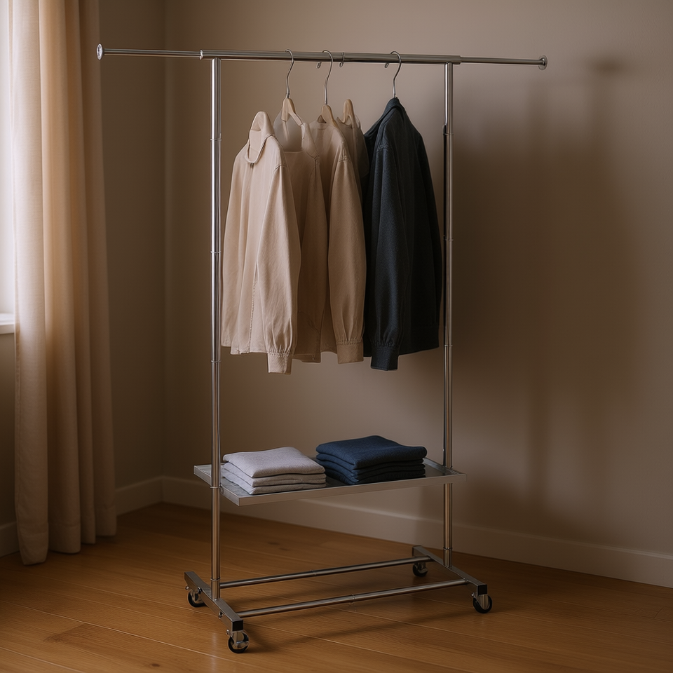 Porte-vêtements en acier inoxydable avec barre de suspension réglable, espace de rangement inférieur et roulettes – Organisateur de garde-robe