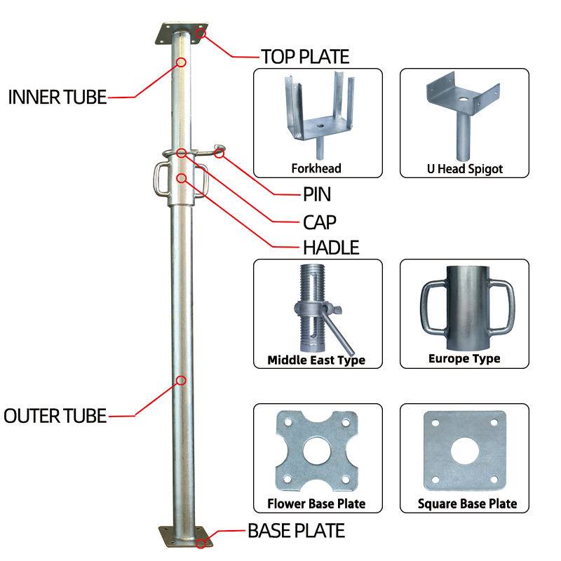 Étai de chantier robuste avec étai de soutènement réglable et étai de poteau offrant un soutien stable pour les coffrages et les échafaudages