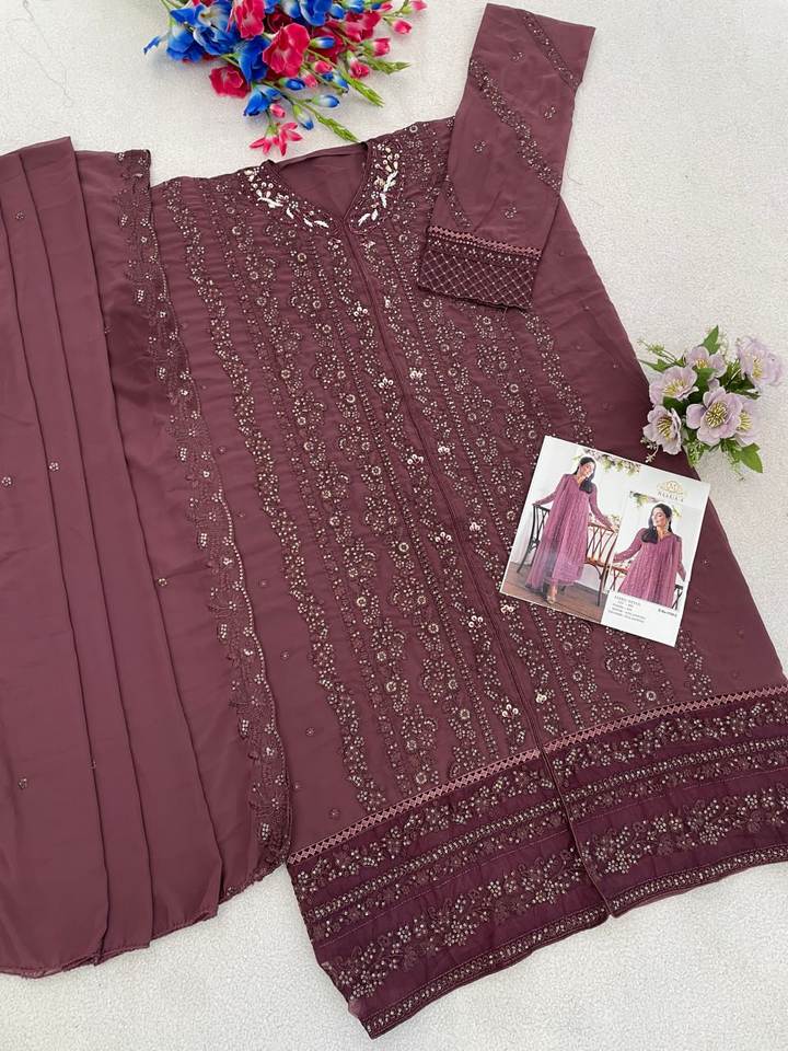 Costume Salwar pakistanais en faux georgette lourd avec broderie multi-fils et sequins, travail de col Khatli pour les fêtes