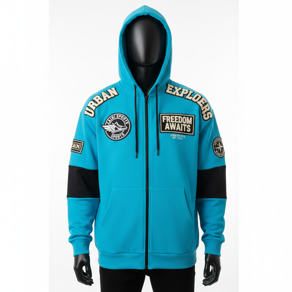 Sweat à capuche zippé en polaire lourde Double couleur Bleu Noir Panneau Streetwear Logo personnalisé Broderie et Patch Design Zip basics Hoodie