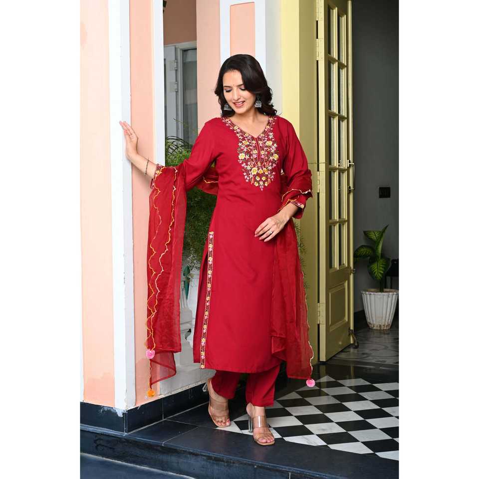 Ensemble Kurta en rayonne rouge brodé de fleurs lourdes avec pantalon et dupatta en organza pour femmes