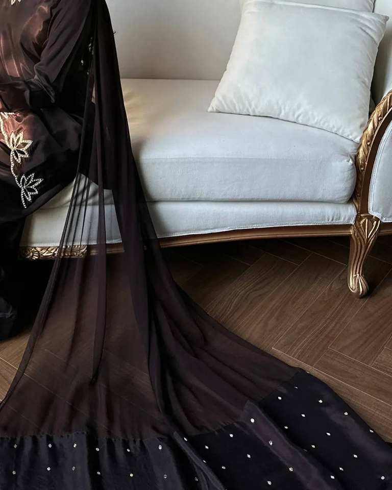 Ensemble de costume ethnique entièrement cousu en crêpe naturel lourd avec broderie et travail de perles, comprenant un haut Farsi Salvar et un dupatta en soie Fox Georgette