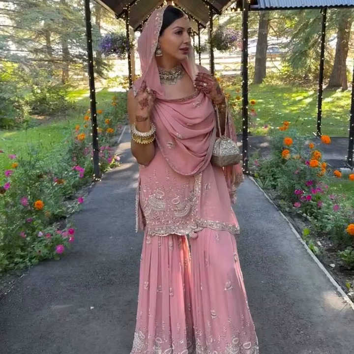 Ensemble Sharara en Georgette brodé de motifs complexes, avec bas de pantalon entièrement cousu et dupatta assorti, tenue de soirée élégante