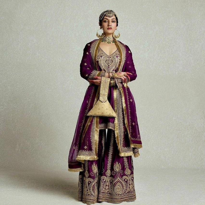 Nouvel arrivage de tissu lourd Gharara Salwar Kamiz Duppata vin couleur indien pakistanais travail de broderie pour la fête de l'Aïd