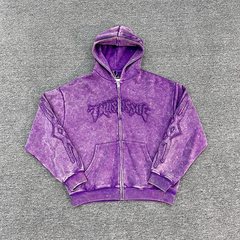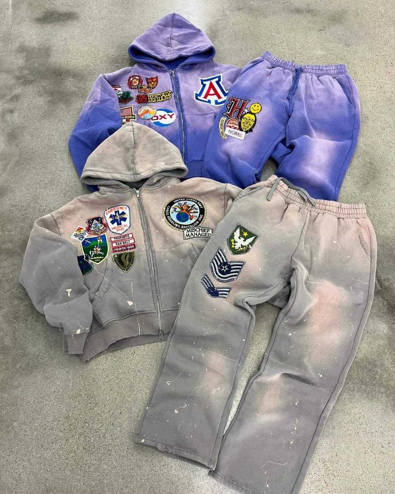 Poids lourd Zip up Terry personnalisé Vintage lavage à l'acide hommes survêtements en détresse surdimensionné soleil délavé à capuche et pantalon de survêtement ensemble
