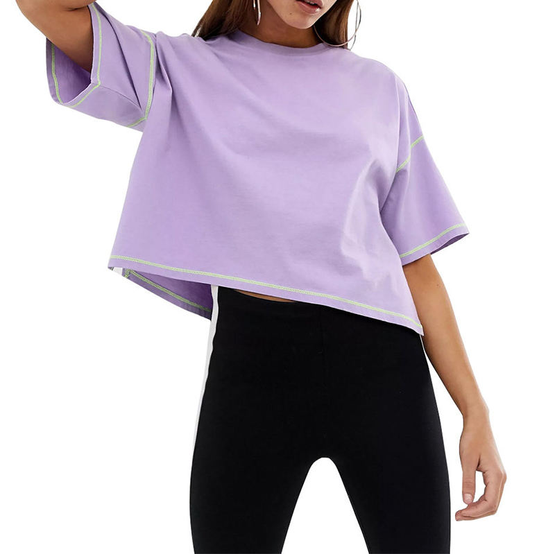 T-shirt coupe carrée en coton épais à épaules tombantes pour femmes col rond revers manches courtes couleur unie haut t-shirts